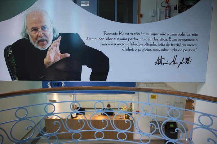 A estátua fica diante de uma construção de 7 mil metros quadrados, linhas curvas, janelas elípticas e círculos vazados na fachada – a sede da Antonio Meneghetti Faculdade, cujas dependências são decoradas com numerosos quadros pintados por Meneghetti e fotos ilustrando sua trajetória. No saguão, a livraria da editora universitária oferece os livros de Meneghetti, que nas páginas finais sempre trazem copiosa bibliografia – listando como fonte outros livros de Meneghetti. Em uma parede entre o primeiro e o segundo piso, há uma grande imagem dele, ar professoral, com uma citação: “Recanto Maestro não é um lugar, não é uma política, não é uma localidade, é uma performance liderística. É um pensamento, uma nova racionalidade aplicada, feita de território, meios, dinheiro, projetos, mas, sobretudo, de pessoas”.
