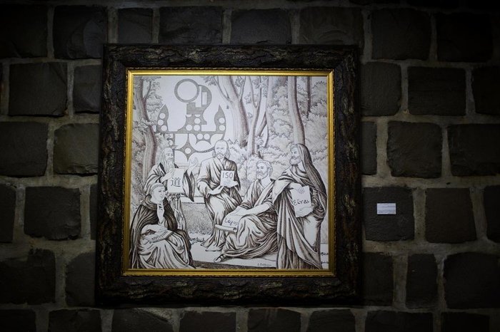 Um um quadro, Meneghetti aparece ao centro de grandes sábios, como Aristóteles, Tomás de Aquino e Lao TséJefferson Botega / Agencia RBS